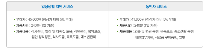 - 동반자서비스 이용 시, 외출동행 및 식료품 구매에 지불되는 금액은 위 서비스 비용에 포함되지 않습니다.